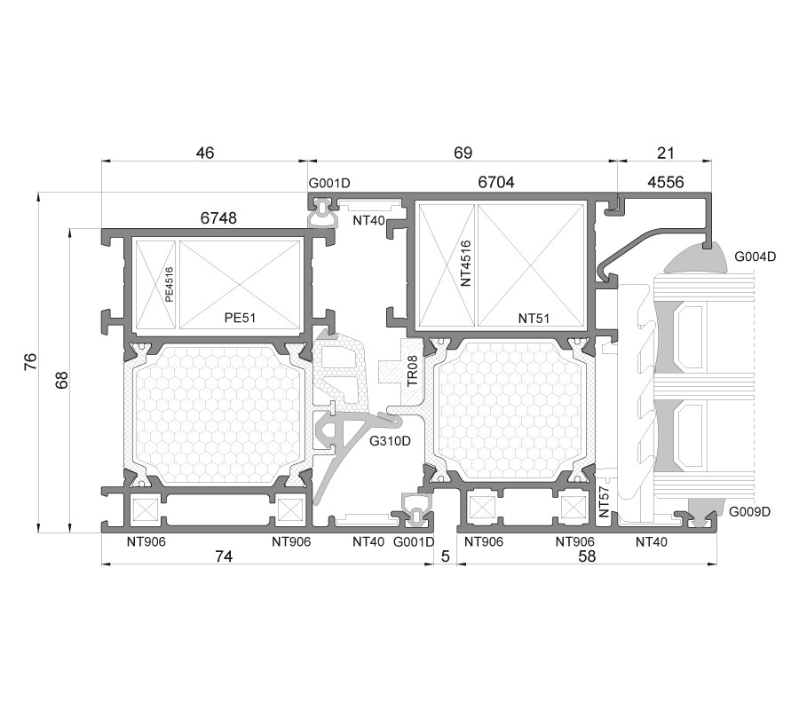 Varianta systému PE68 HI o tříkomorové konstrukci profilů s drážkou pro kování ve standardu „euro“ a drážkou pro kování používaných na oknech a balkonových dveřích vyrobené z PVC či dřeva. Konstrukční hloubka rámu je 68 mm a hloubka křídla je 76 mm. Systém umožňuje použití výplní o tloušťce 18-59 mm. Z jeho hlavních nesporných výhod je zvýšení tepelného komfortu, který je dosažen osazením speciální izolační vložky.