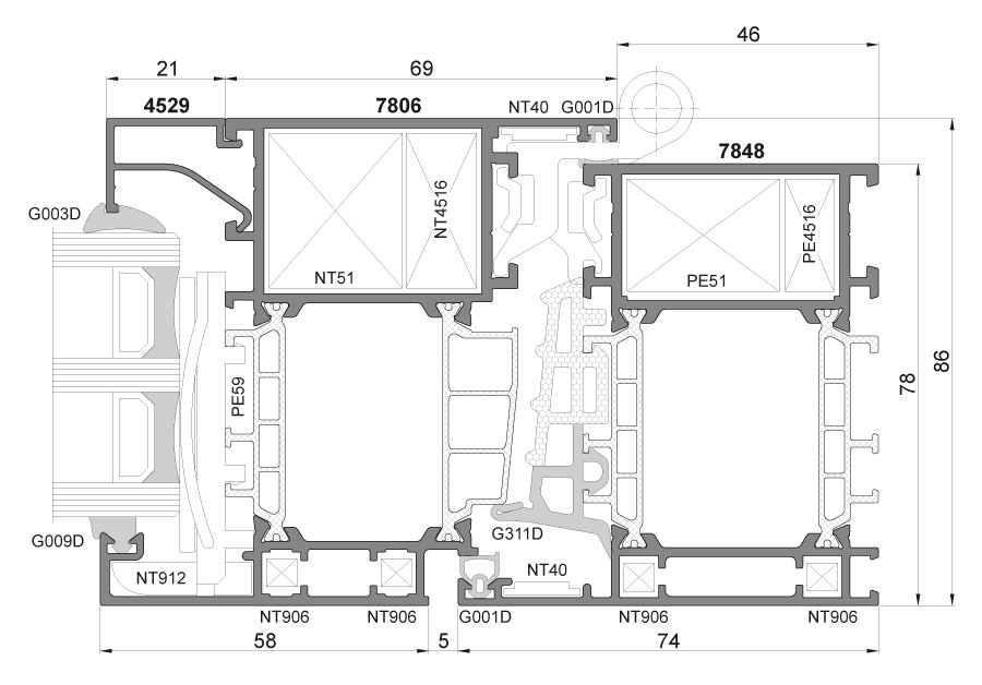 Systém má tříkomorovou konstrukci profilů s drážkou pro kování standardu "euro" a s drážkou používanou pro okna a balkonové dveře jz profilů PVC či dřeva. Je určen pro výrobu oken s obzvláště vysokými požadavky na tepelnou izolaci. Konstrukční hloubka profilu rámů je 78 mm, a 86 mm pro křídla. Je použito tepelně izolační vyplnění o tl 42 mm a dvousložkové středové těsnění. Toto vše se podílí na vysoké hodnotě tepelné izolačnosti profilu. Ve verzi PE78N je součinitel prostupu tepla od 1.7 W/m2K, v teplejší verzi PE78N+ s uzavřenou podskelní komorou je Uf od 1.3 W/m2K.