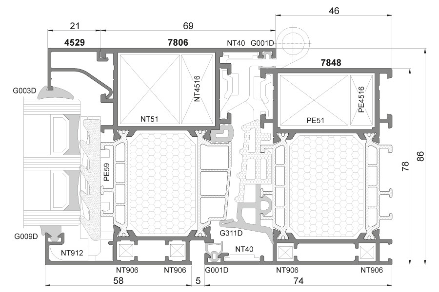 Varianta systému PE78N určená pro použití v konstrukcích o velmi vysokými požadavky na tepelnou izolačnost. Díky speciálním vložkám, můžete získat velmi vysokou tepelnou izolačnost. V závislosti na umístění, v kterém je zakomponovaná dodatečná výplň, systém dosáhne jinou hodnotu součinitele prostupu tepla. V teplejší verzi PE78N HI s uzavřenou podskelní komorou a tepelně izolační vložkou je tepelný součinitel Uf - od 0,9 W/m2K. V nejteplejší variantě PE78N HI+ s uzavřenou podskelní komorou a tepelně izolační vložkou z aerogelu dosahuje hodnot Uf - od 0,7 W/m2K.